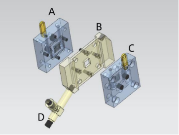 As shown in the above figure, the electrolytic cell adopts a sandwich structure and is divided into four parts: A, B, C, and D.